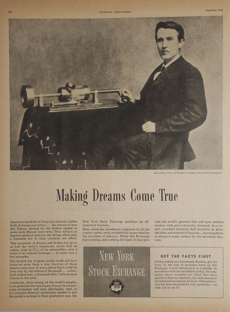 The New York Stock Exchange ad featuring the Mathew Brady 1878 photograph of Edison with his "Brady" tinfoil Phonograph. "Making Dreams Come True." The Country Gentleman, September 1946