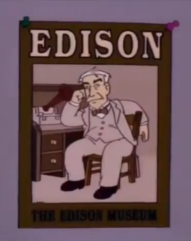 Homer relentlessly talks about Edison, boring his friends and family. (Simpson's Season 10, Episode 2)